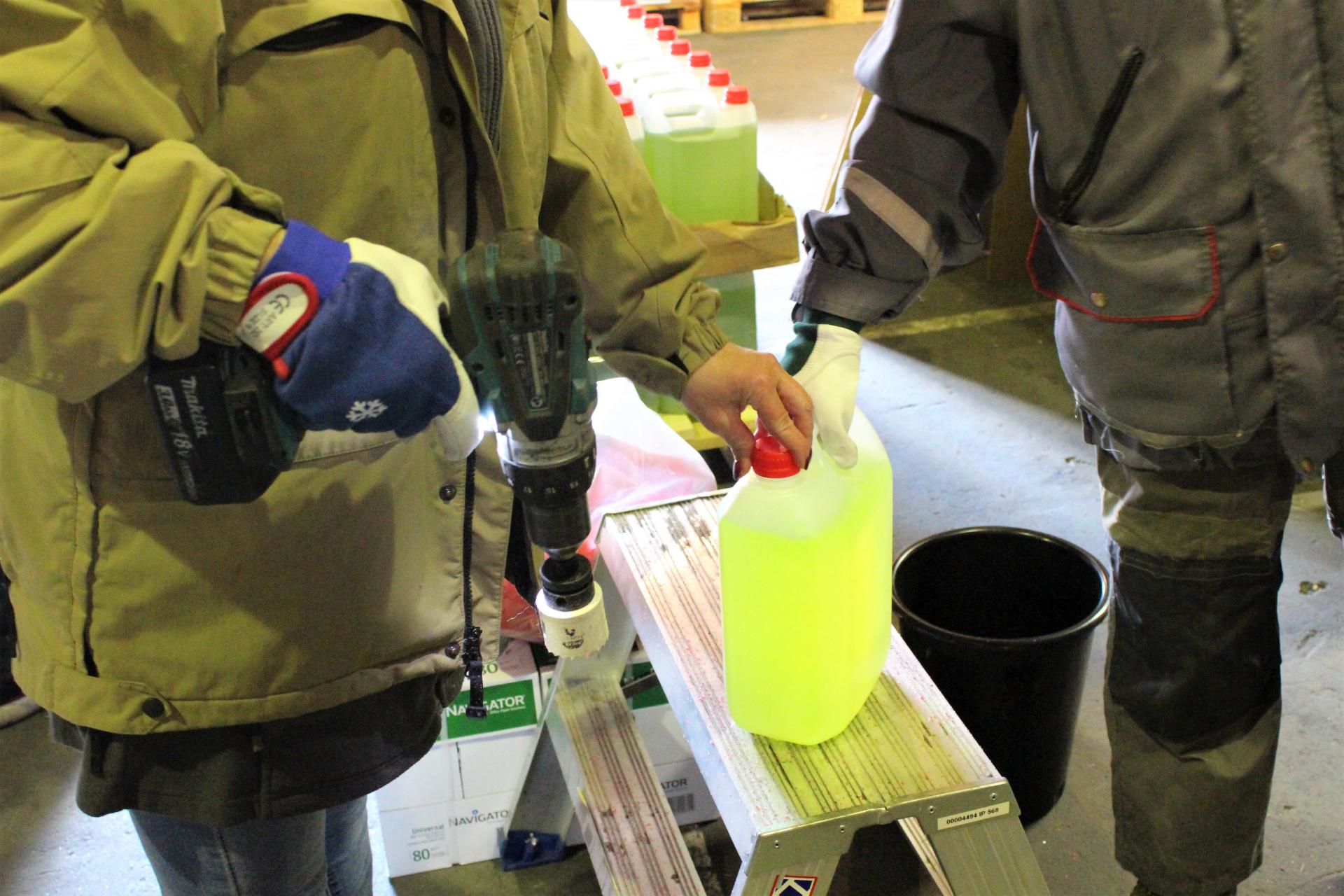 Otrdien, 19.maijā, Nodrošinājuma valsts aģentūras darbinieki nodrošināja aptuveni 8640 litru konfiscētā spirtu saturošā šķidruma safasēšanu 1728 kannās nodošanai Krīzes vadības centram tālākai rīcībai. Līdz šīs nedēļas beigām Nodrošinājuma valsts aģentūra plāno nodrošināt vēl apmēram 6 tonnu konfiscētā spirtu saturošā šķidruma fasēšanu un nodošanu Krīzes vadības centram.