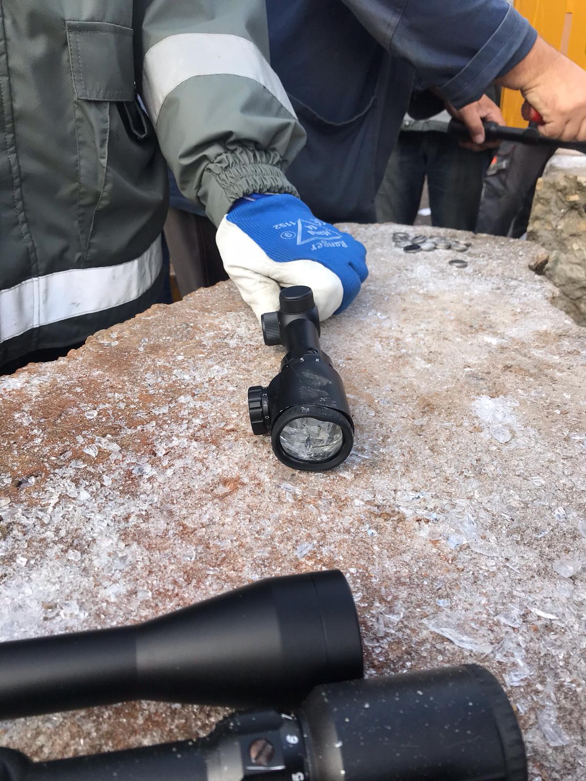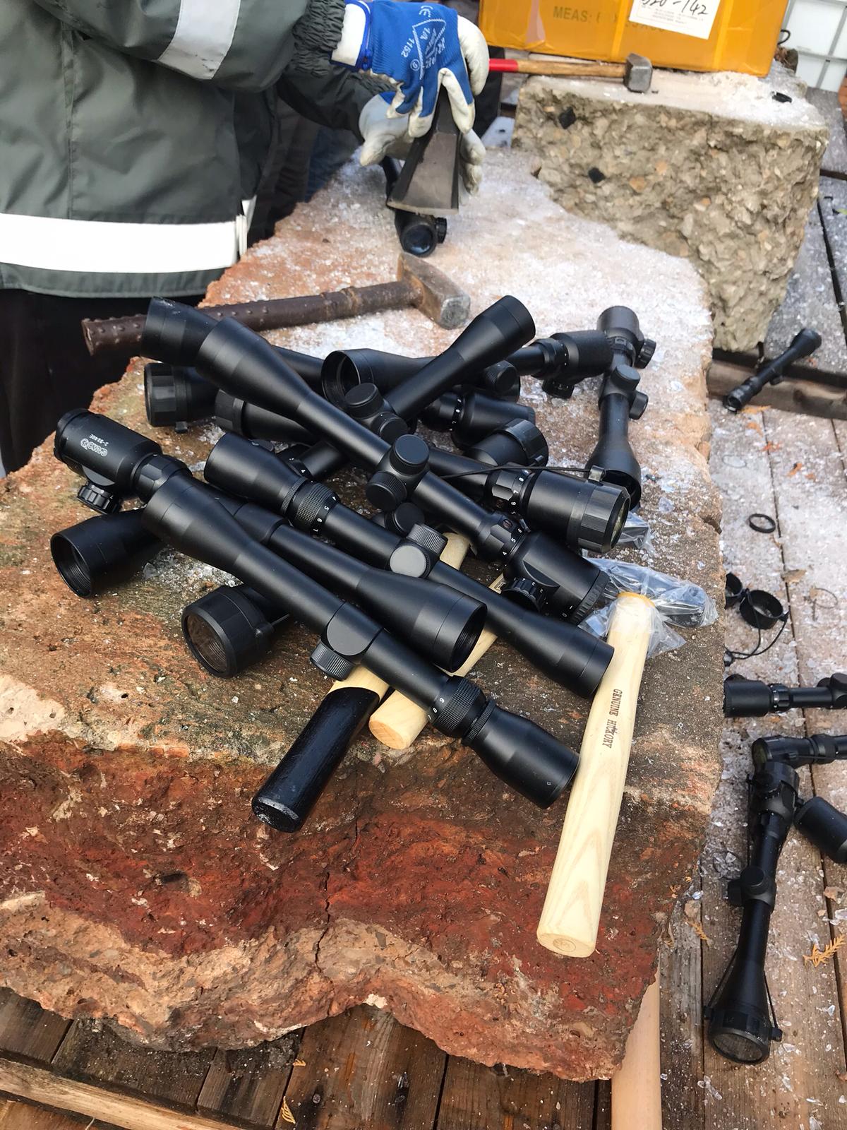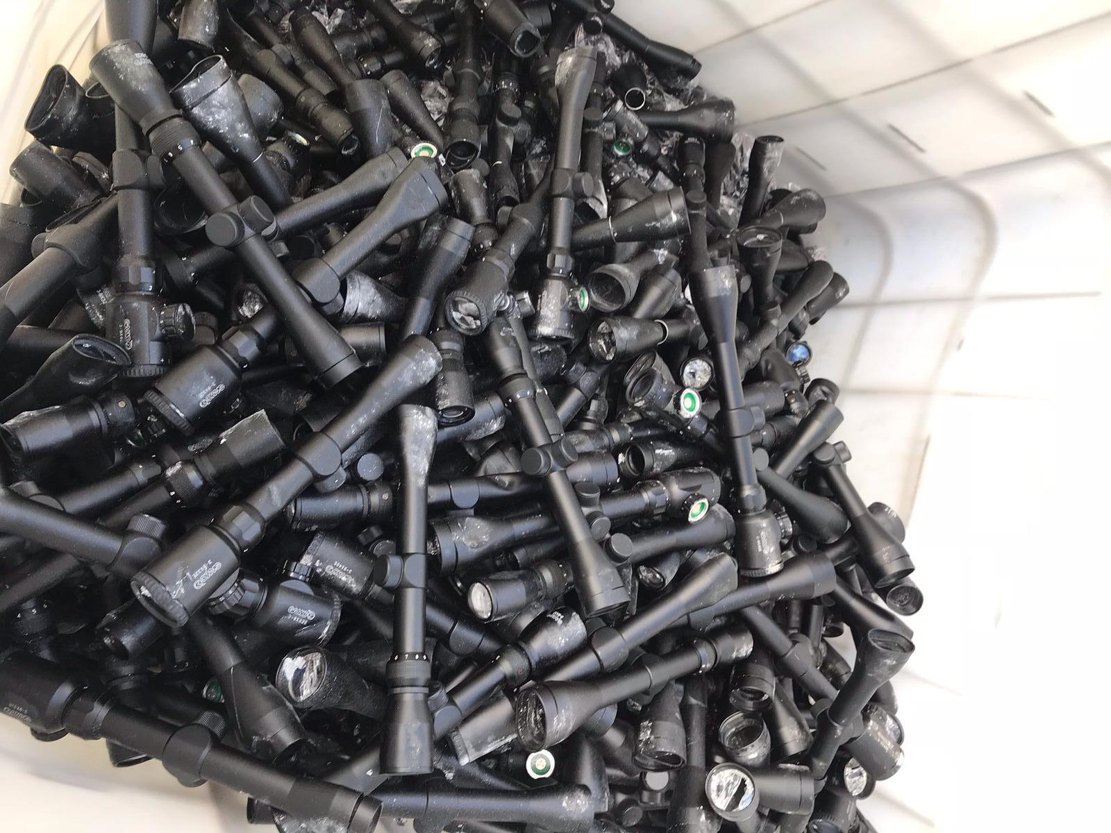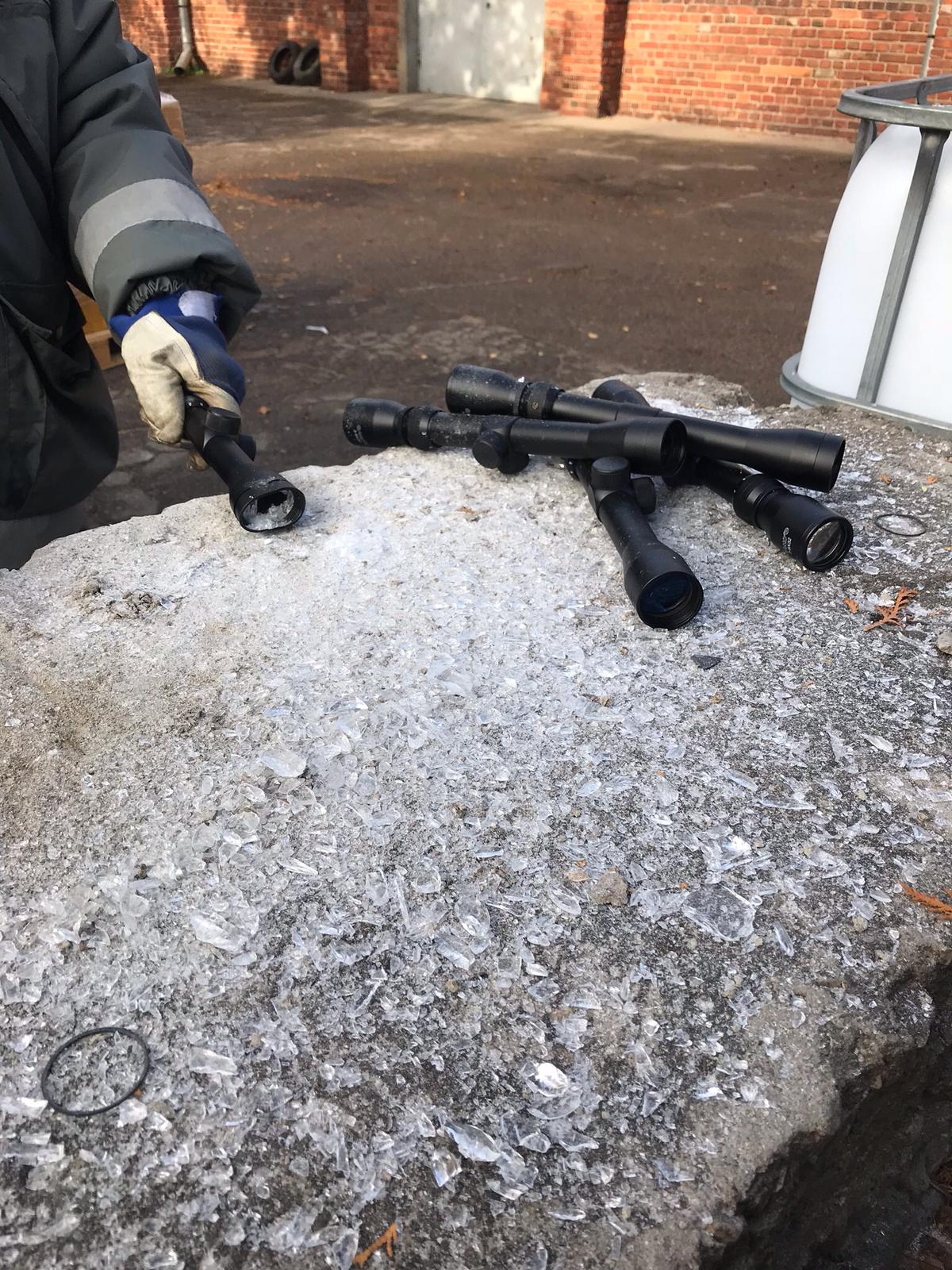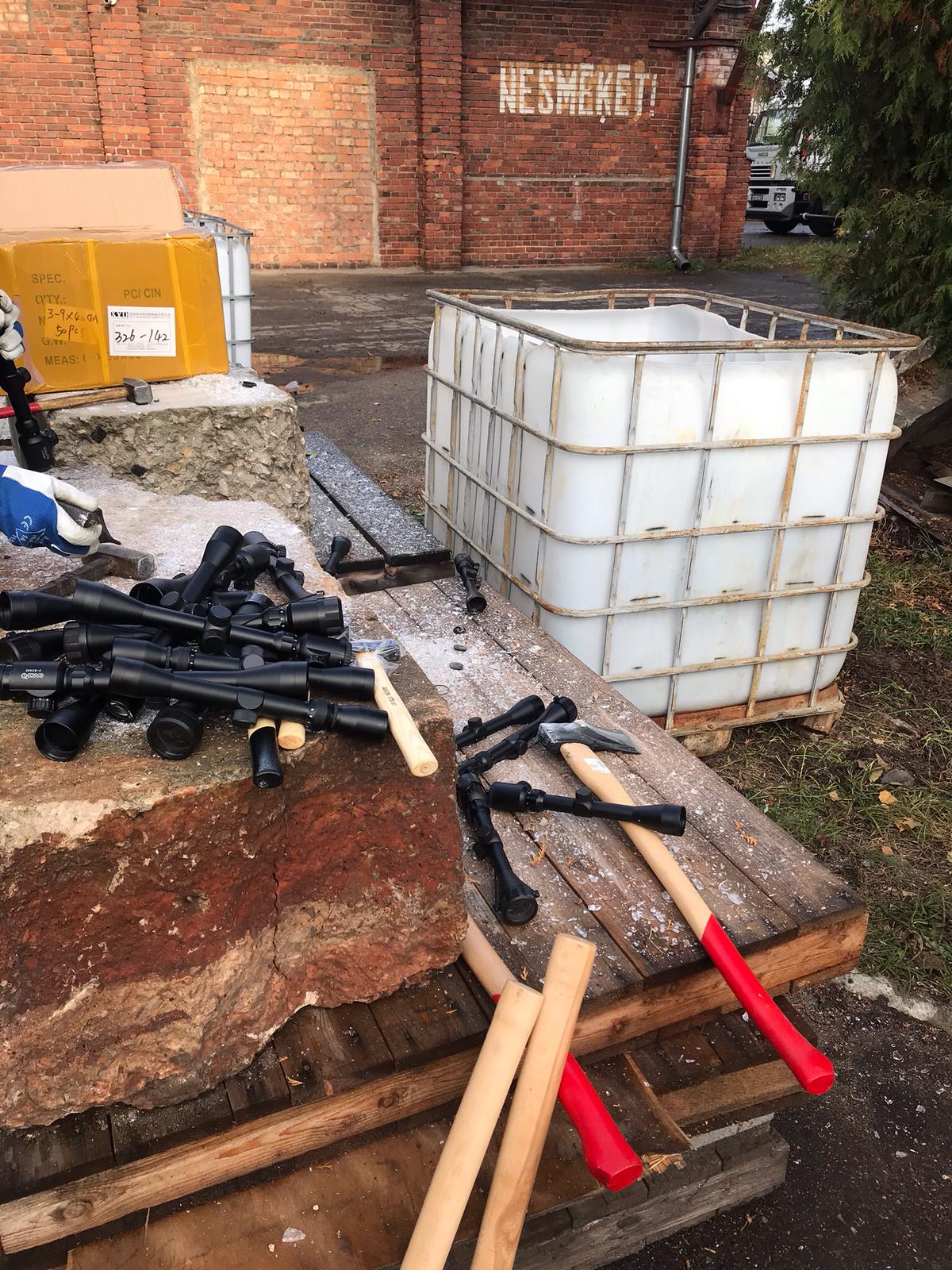 Nodrošinājuma valsts aģentūras Izņemto lietu, piedziņas un materiālās apgādes departamenta Izņemto lietu nodaļas darbinieki sadarbībā ar Materiāli tehniskās apgādes nodaļas darbiniekiem iznīcināja 1998 savulaik nelikumīgi Latvijā ievestos optiskos tēmekļus.