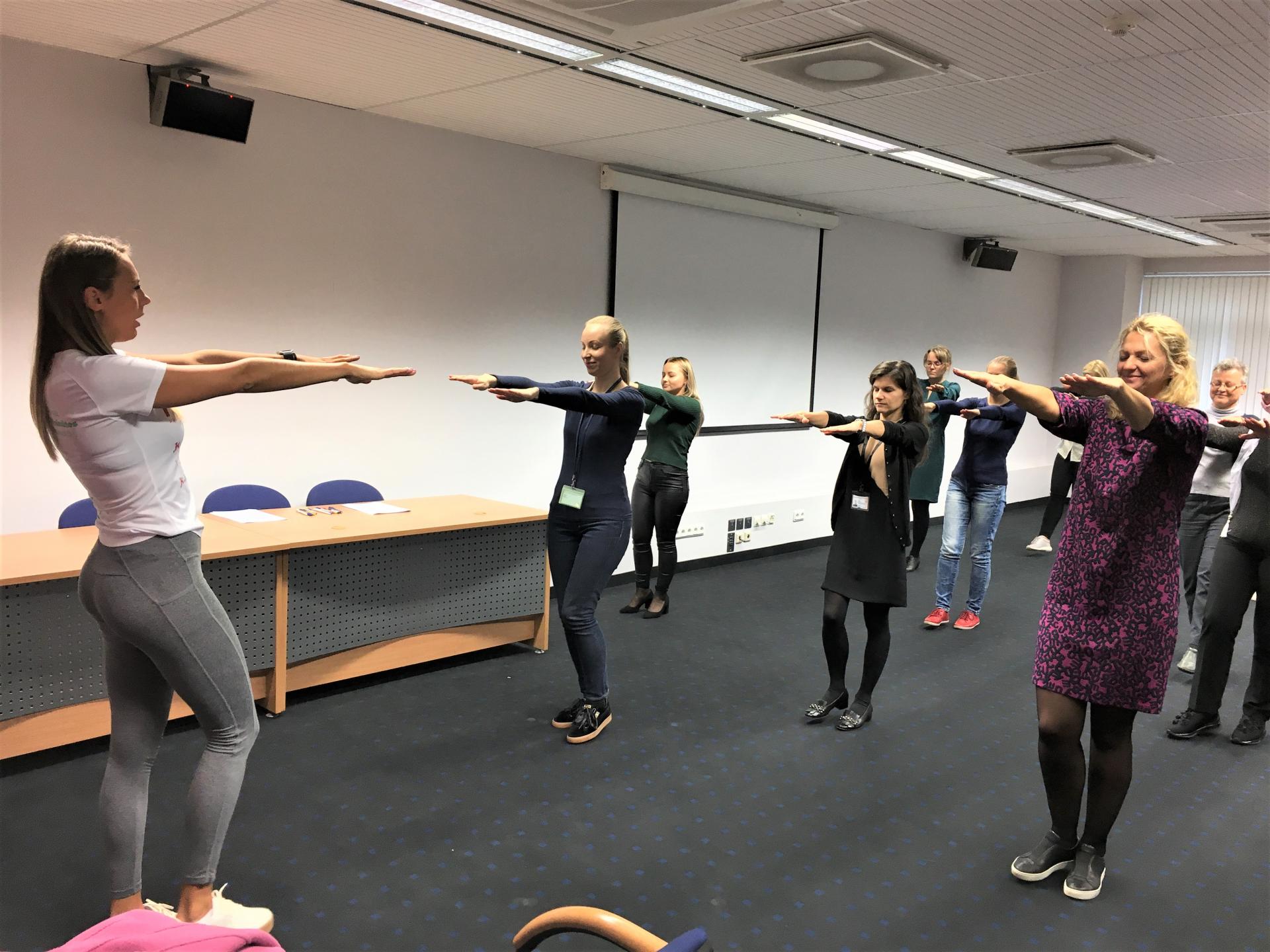 Nodarbības laikā fizioterapeite Sintija Priede ne tikai demonstrēja vingrojumus, kas var palīdzēt biroju darbiniekiem justies labāk, ikdienā lielākoties strādājot pie datoriem, bet arī skaidroja iespējamos cēloņus un sekas sāpēm, kas rodas sēdoša darba veicējiem, kā arī mudināja regulāri kopīgi (vai arī katrs atsevišķi) izkustēties, tādējādi stiprinot fizisko un garīgo veselību. Pēc nodarbības dalībnieki arī izmantoja iespēju klātienē uzzināt speciālista viedokli un ieteikumus viņus interesējošos jautājumos.