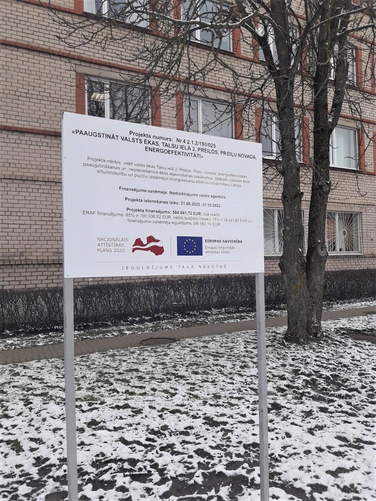 Nodrošinājuma valsts aģentūra Eiropas Reģionālās attīstības fonda darbības programmas “Izaugsme un nodarbinātība” 4.2.1. specifiskā atbalsta mērķa “Veicināt energoefektivitātes paaugstināšanu valsts un dzīvojamās ēkās” 4.2.1.2. pasākuma “Veicināt energoefektivitātes paaugstināšanu valsts ēkās” pirmās projektu iesniegumu atlases kārtas ietvaros īsteno projektu Nr.4.2.1.2/19/I/025 “Paaugstināt valsts ēkas Talsu ielā 2, Preiļos, Preiļu novadā, energoefektivitāti”.