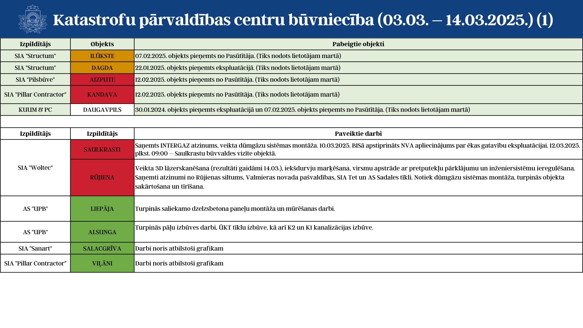 Aktuālā informācija par katastrofu pārvaldības centru būvniecību (03.03. – 14.03.2025.)