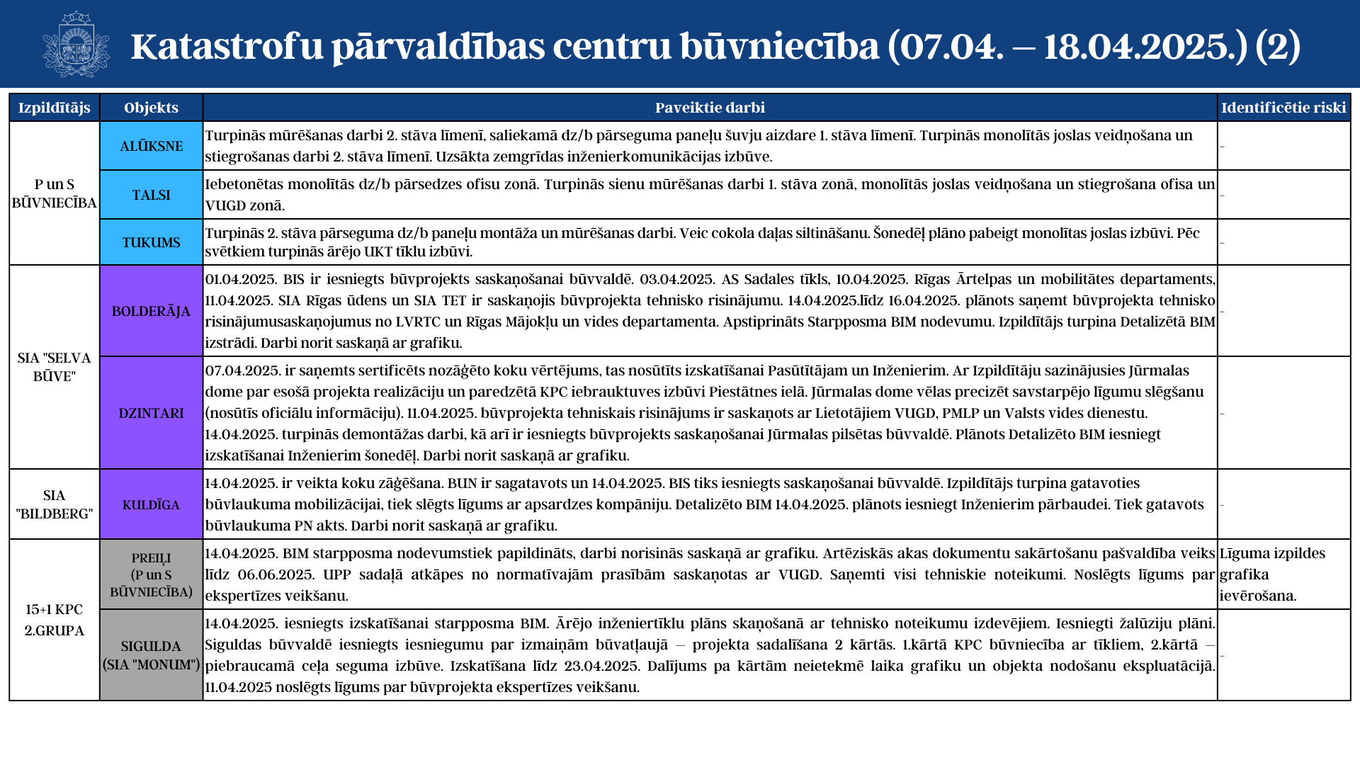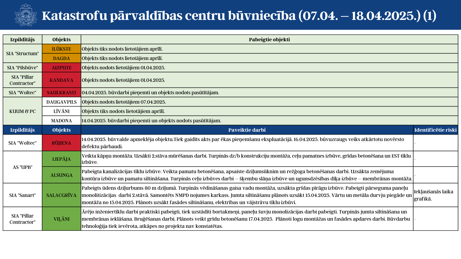 Aktuālā informācija par katastrofu pārvaldības centru būvniecību (07.04. - 18.04.2025.)