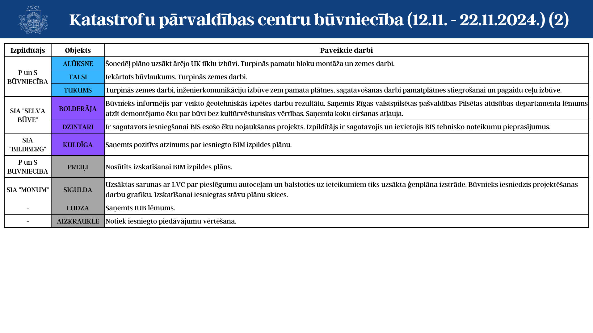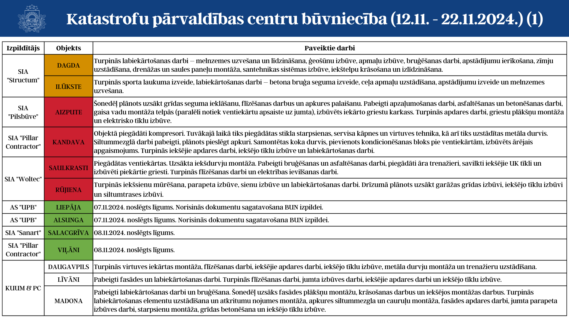 Aktuālā informācija par katastrofu pārvaldības centru būvniecību (12.11. - 22.11.2024.)
