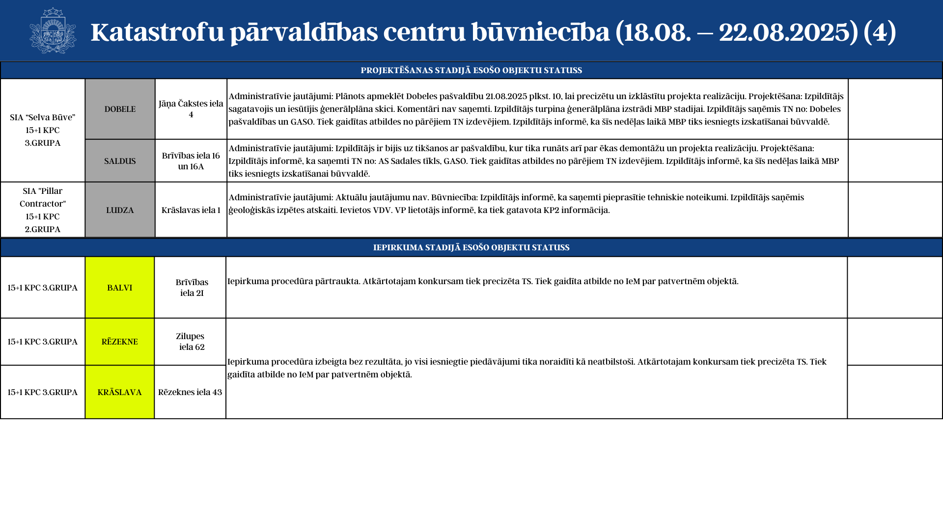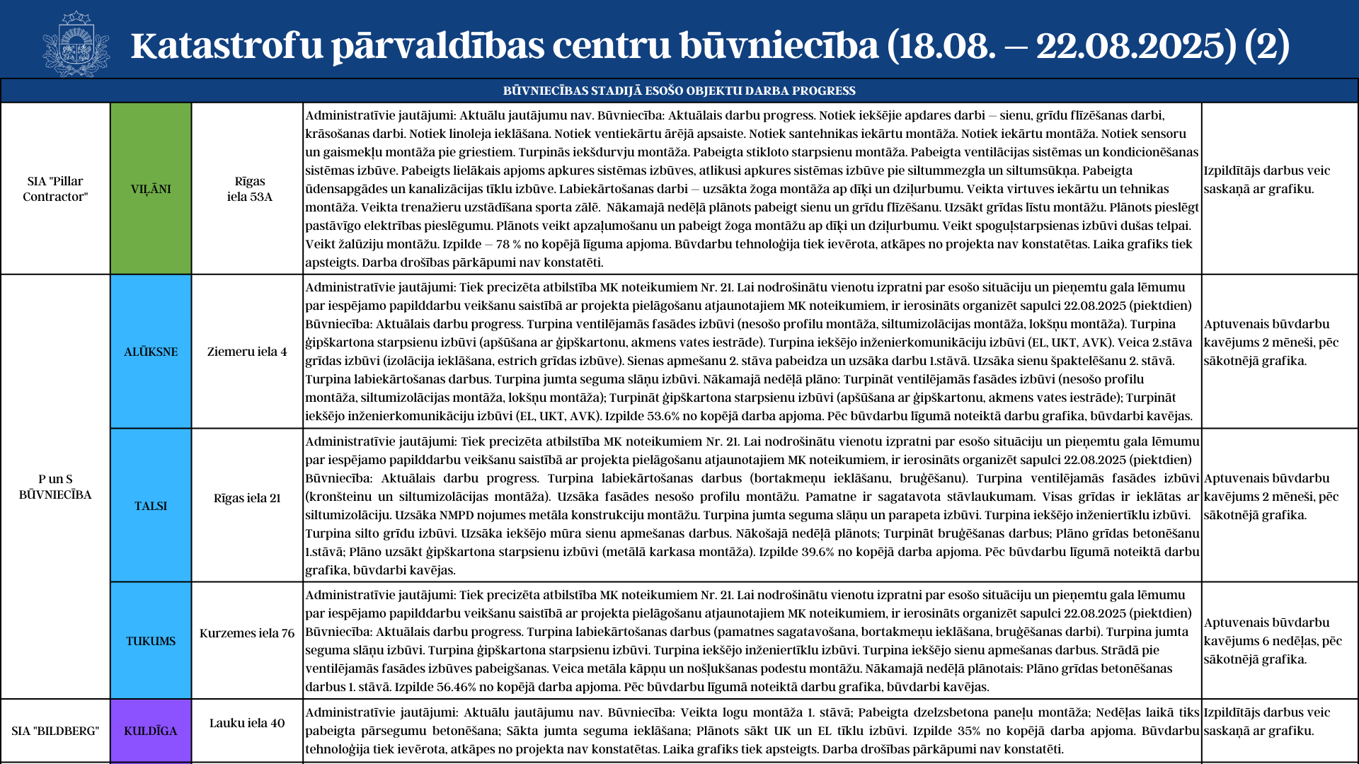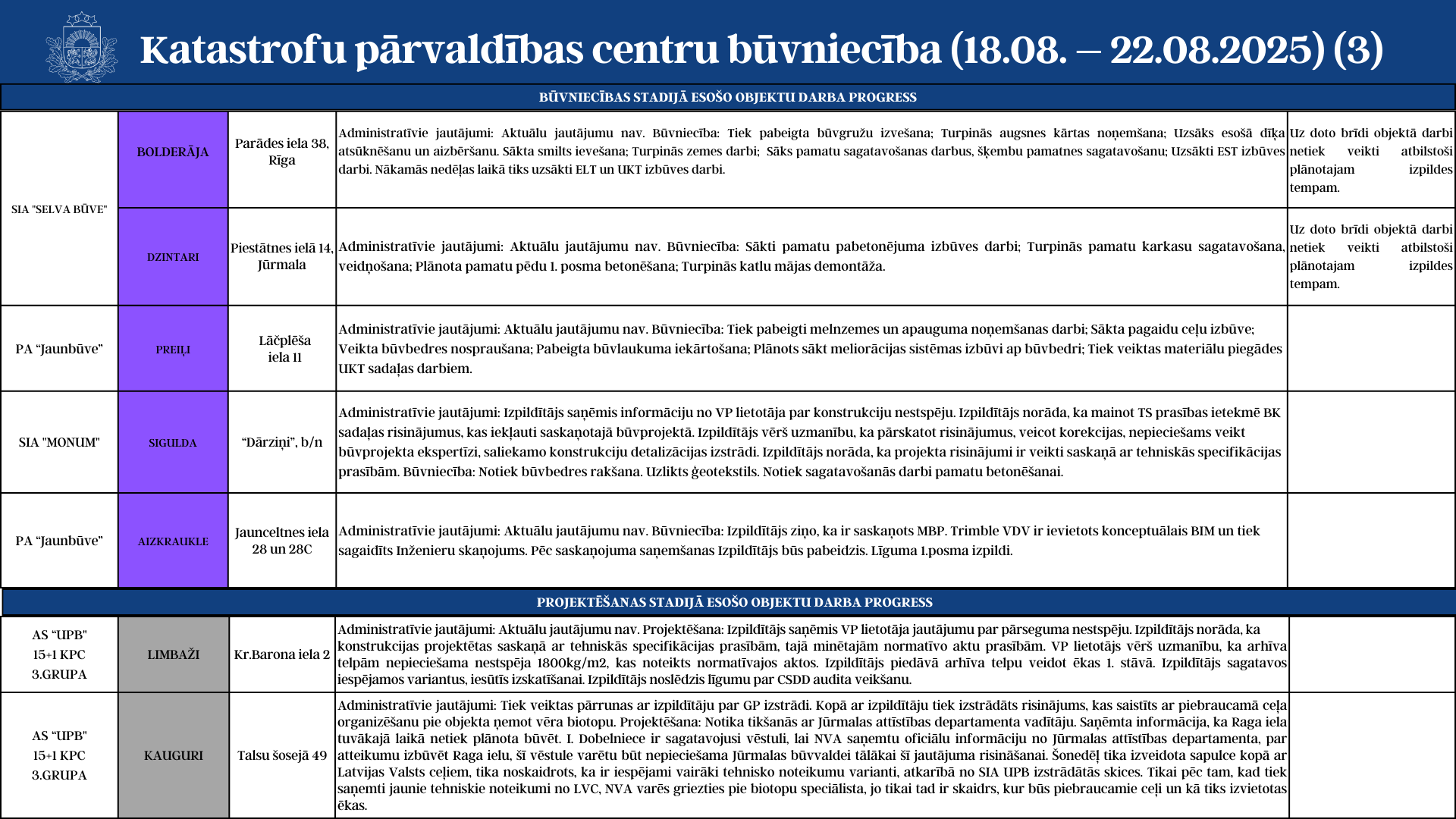 Aktuālā informācija par katastrofu pārvaldības centru būvniecību (18.08. - 22.08.2025.)