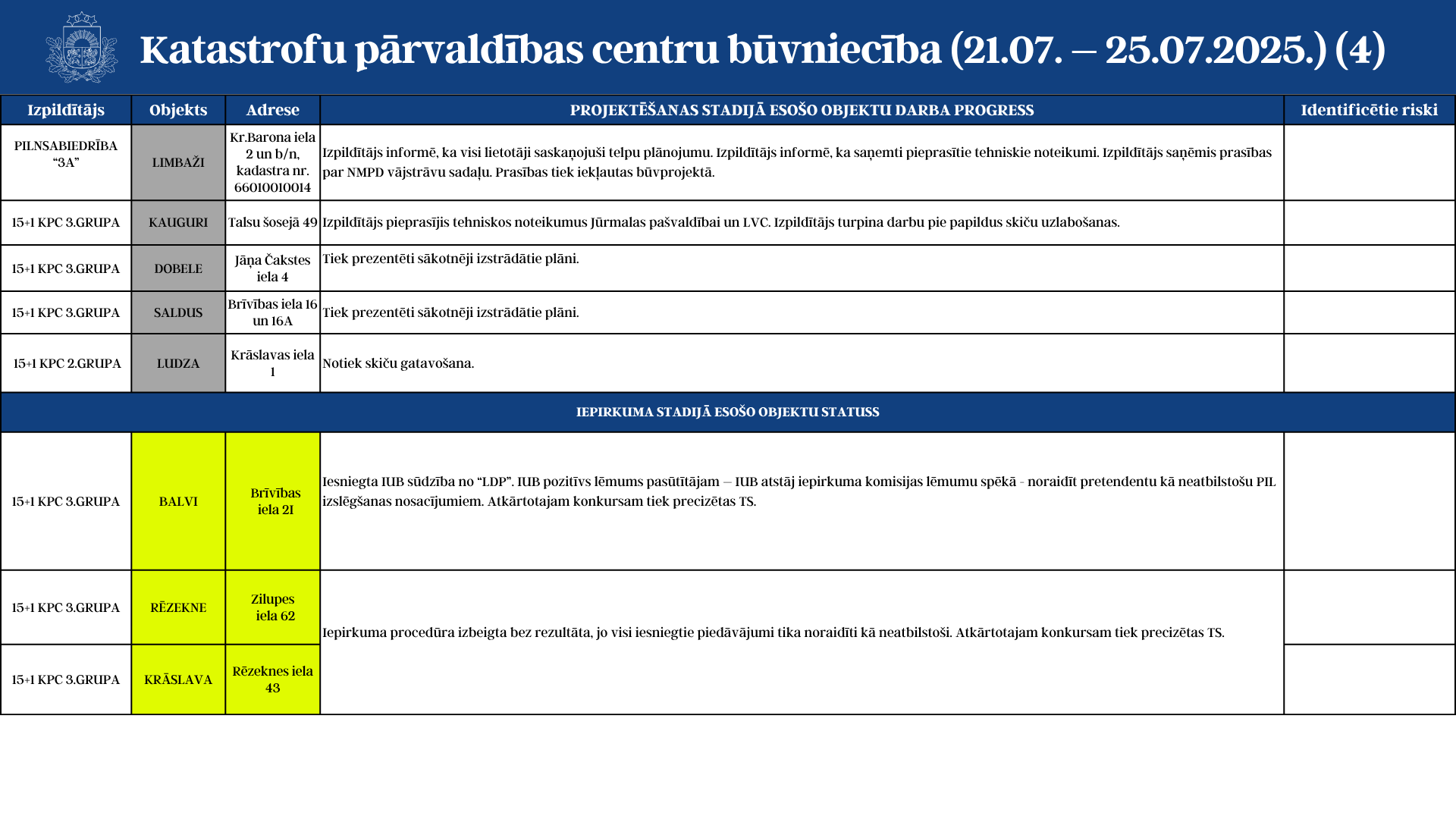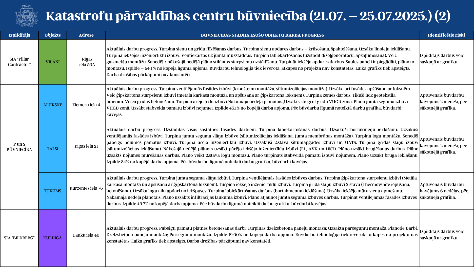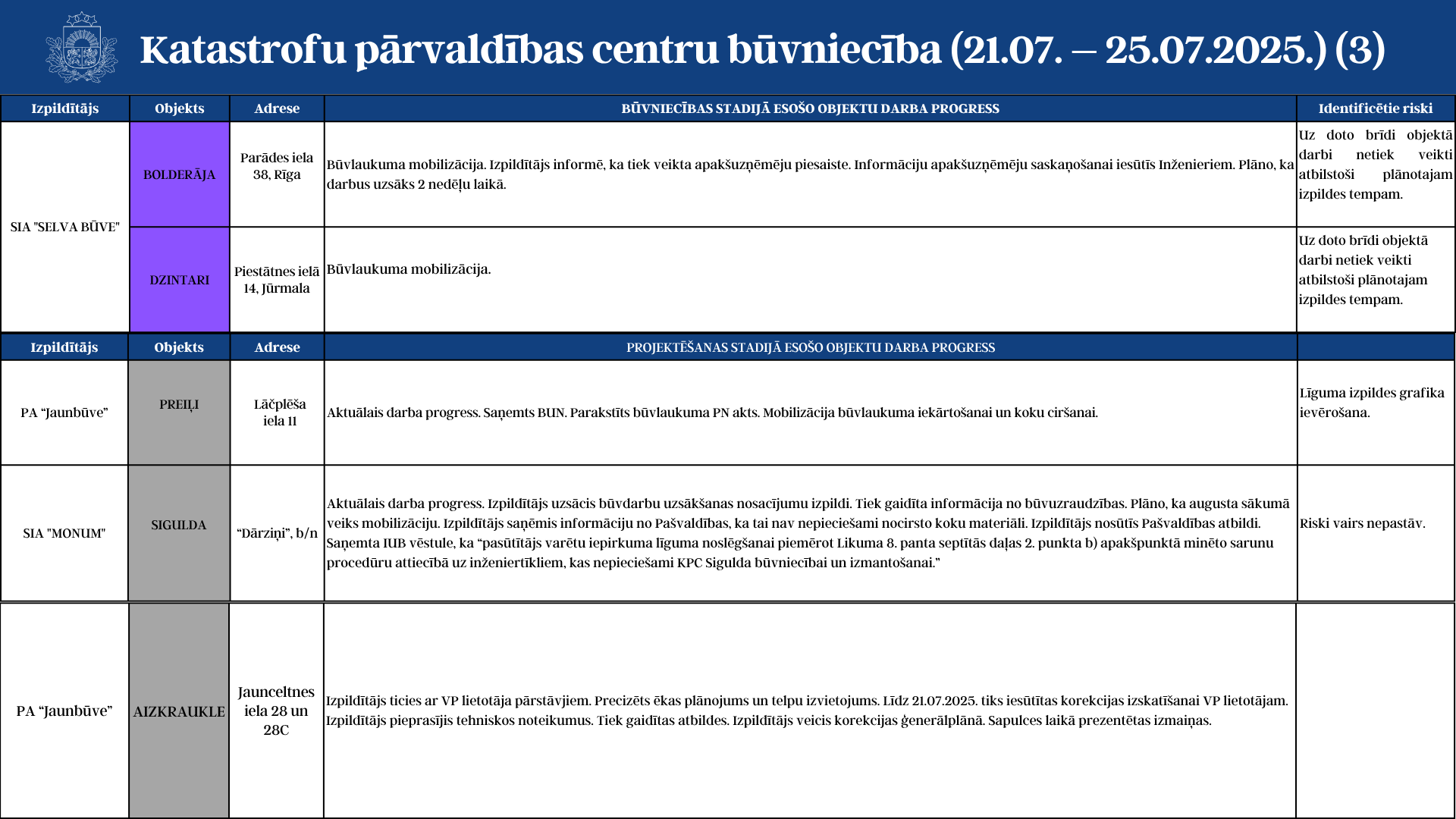 Aktuālā informācija par katastrofu pārvaldības centru būvniecību (21.07. - 25.07.2025.)