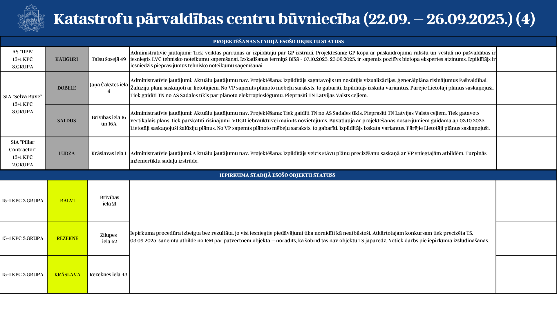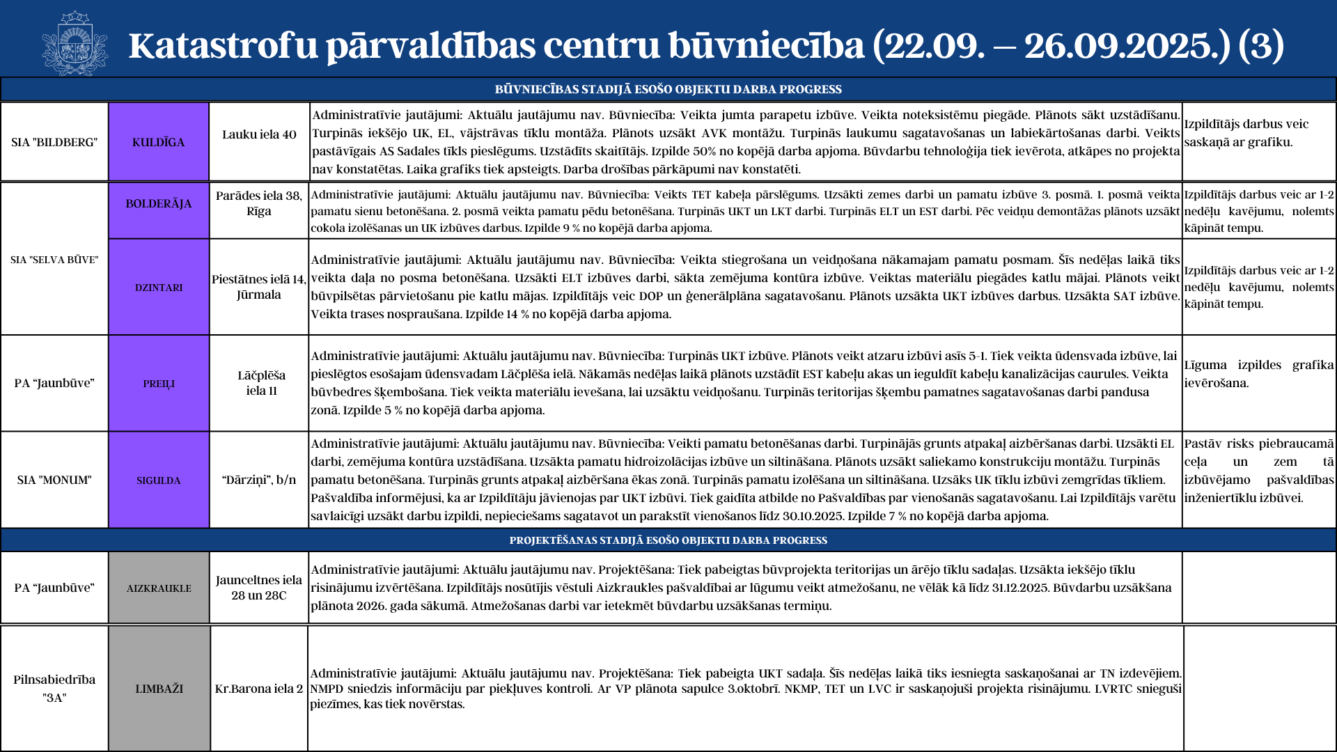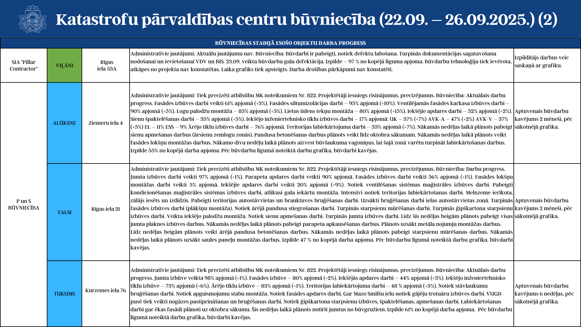 Aktuālā informācija par katastrofu pārvaldības centru būvniecību (22.09. - 26.09.2025.)