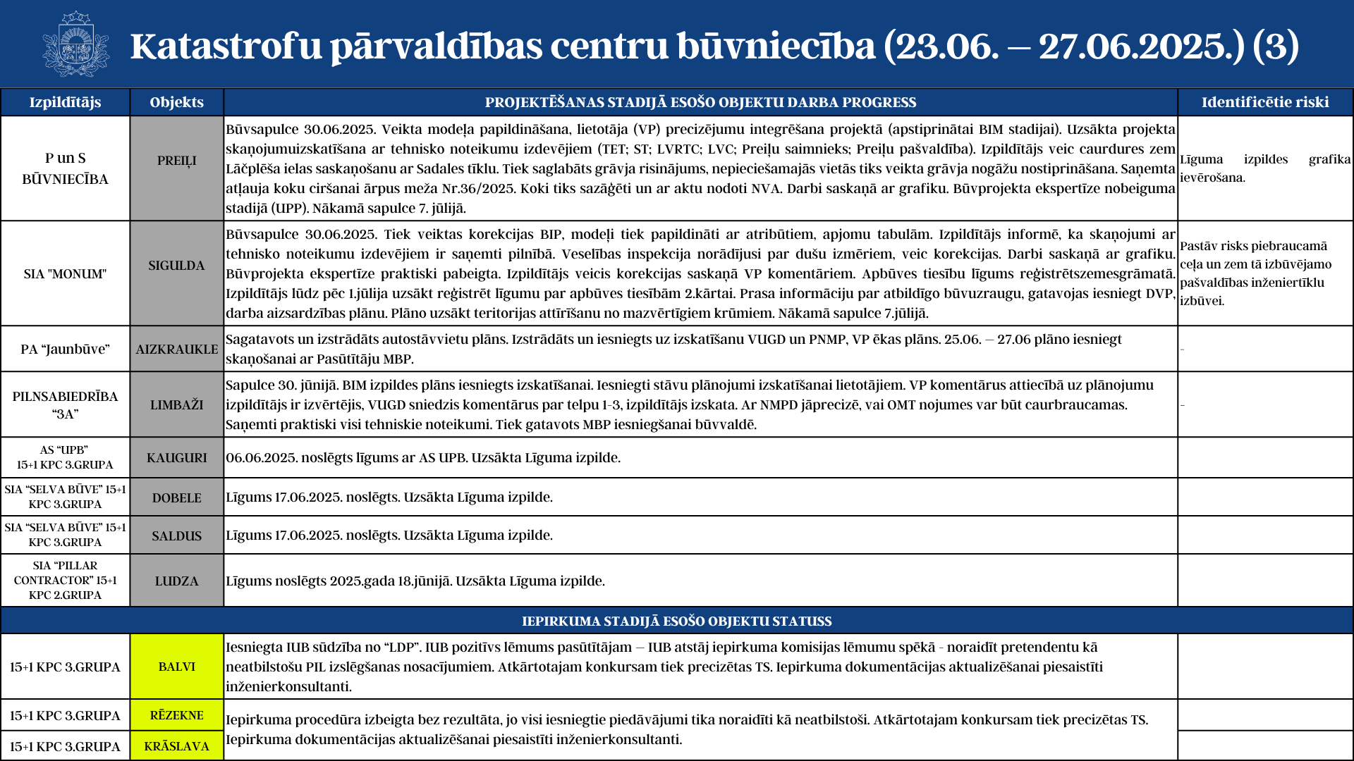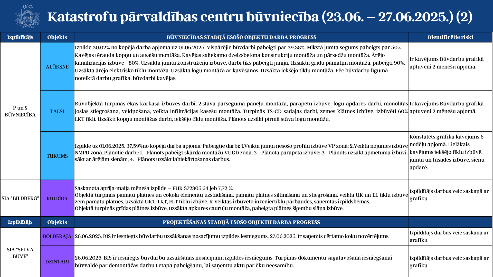Aktuālā informācija par katastrofu pārvaldības centru būvniecību (23.06. - 27.06.2025.)