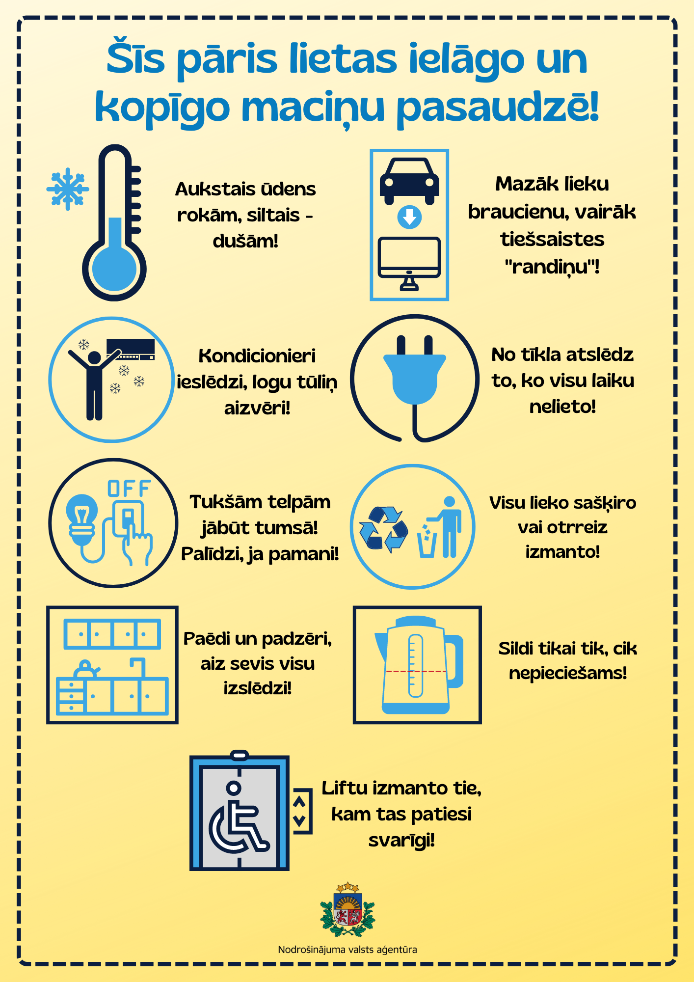 Lai atgādinātu par to, ka nepieciešams taupīt, piedāvājam darba vietās izvietot aģentūras izstrādātās vadlīnijas energoresursu ekonomēšanai un vizuālo materiālu lietošanai. Lūdzam iestāžu vadītājus informēt iestādes darbiniekus par šo noteikumu stingru ievērošanu.