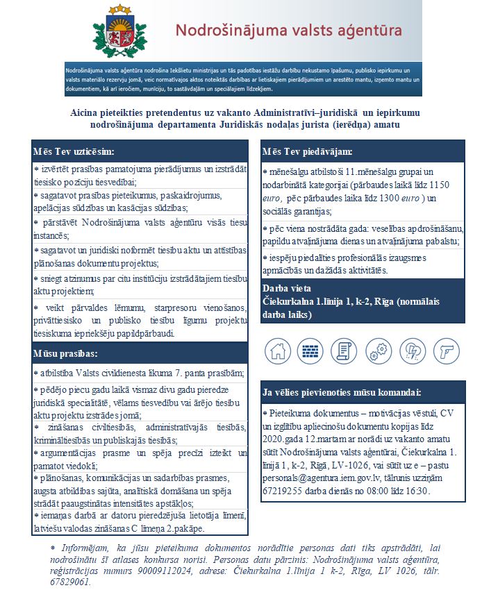 Nodrošinājuma valsts aģentūra aicina pieteikties uz vakanto Administratīvi-juridiskā un iepirkumu nodrošinājuma departamenta Juridiskās nodaļas jurista (ierēdņa) amatu